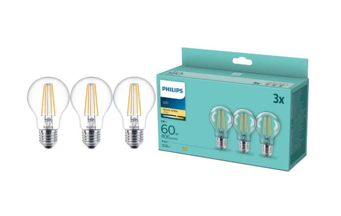 Pachet 3 becuri LED filament Philips, A60, E27, 7W (60W), 806 lm, lumina alba calda (2700K), clasa energetica E