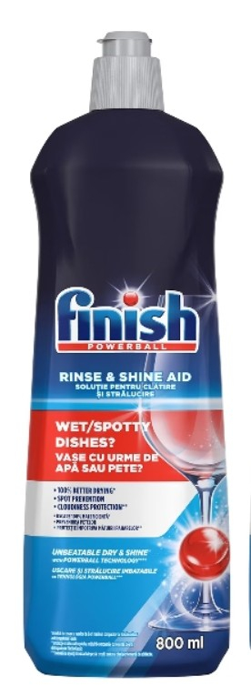 Cu ajutorul solutiei de clatire Finish nu mai este nevoie sa uscati vasele dupa spalare, astfel castigati timp si aveti vase uscate si stralucitoare, direct din masina de spalat vase!