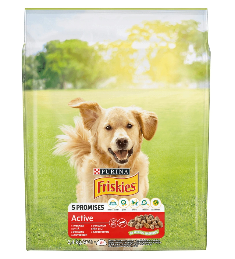 PURINA® FRISKIES Vitafit Active este o reteta gustoasa cu vita, combinata cu cereale integrale, continand vitamina B si acizi grasi Omega 3 si 6. FRISKIES Active este un sortiment creat pentru caini plini de energie care vor mereu sa se joace.