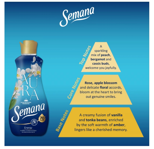 Semana AURA: Noua gama de balsamuri de rufe super concentrate de la Semana. Formula imbogatita cu parfumuri care iti imbunatatesc starea de spirit are grija atat de hainele tale, cat si de starea ta. Semana Aura – parfumurile noastre, aura ta. Incarca-ti ziua cu prospetime! Parfumul curat si revigorant, cu note fructate si usor rozate, se incheie cu obaza calda, dulce, cu iz de vanilie, pentru o senzatie fresh si energizanta.