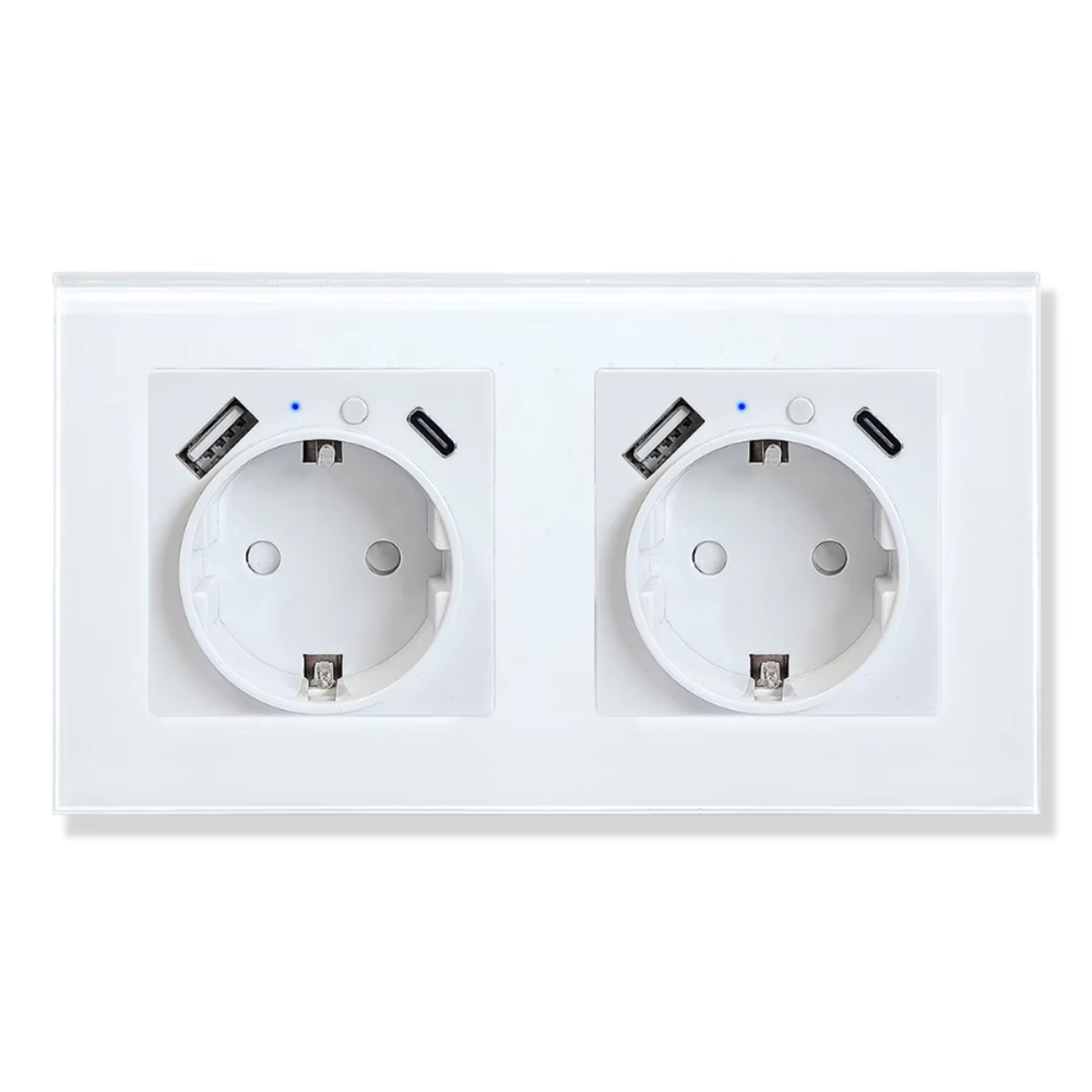 Priza inteligenta de perete wireless, Dubla, USB Type C si USB A, Rama de Sticla Securizata, Compatibila cu Google Assistant/Alexa , Aplicatie Tuya/Smart Life, Contorizare si Monitorizare Consum , Alb